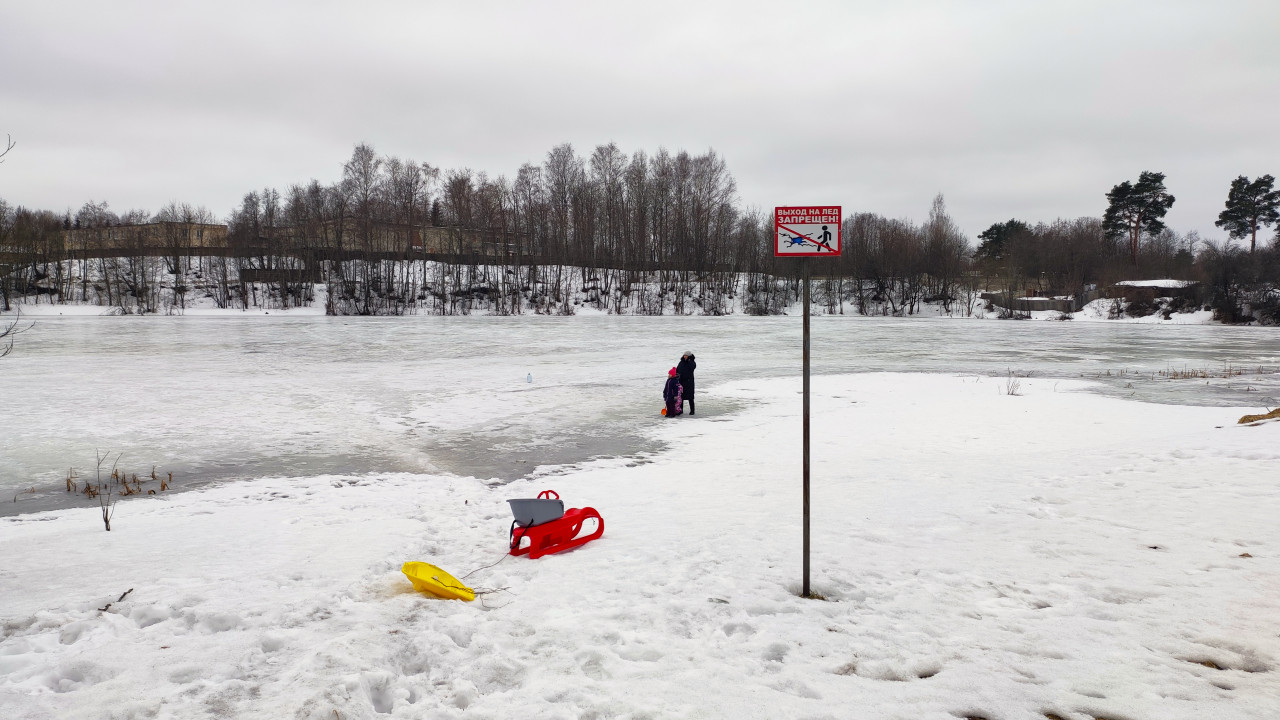 На снимке изображён пруд, покрытый льдом, на берегу которого установлен знак с надписью «Выход на лёд запрещён». Несмотря на предупреждение, на льду видны взрослый и ребёнок. На переднем плане находятся детские сани и снегокат. Пейзаж типичен для поздней зимы: серое небо, заснеженная поверхность и редкие деревья. Фото подходит для использования в материалах о нарушении правил безопасности, зимних рисках и поведении у водоёмов.