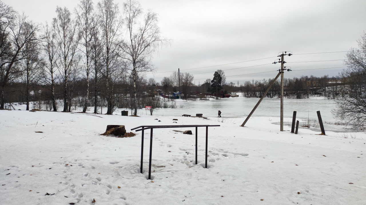 На фото изображён зимний берег замёрзшего водоёма с заснеженным покровом и следами на снегу. На переднем плане установлена металлическая конструкция без очевидного назначения. Вдали виден человек, переходящий по льду, а также деревья и жилые постройки за водоёмом. Погода пасмурная, небо серое. Сцена передаёт реалистичный вид зимнего дня в провинциальном городе России. Фото можно использовать для иллюстраций на темы зимней экологии, безопасности и городской среды.