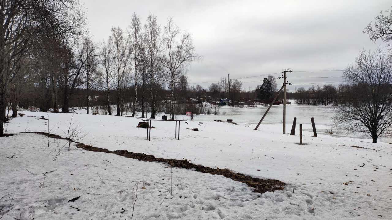 На изображении заснеженный берег с пнями деревьев и металлическими конструкциями. На заднем плане виден замёрзший водоём, пересечённый линиями электропередачи. Среди деревьев можно заметить знак с предупреждением. Пейзаж типичен для российских населённых пунктов в зимний сезон, где сочетаются природные и техногенные элементы. Фотографию можно использовать для тем экологии, инфраструктуры, зимнего климата и сельских территорий.