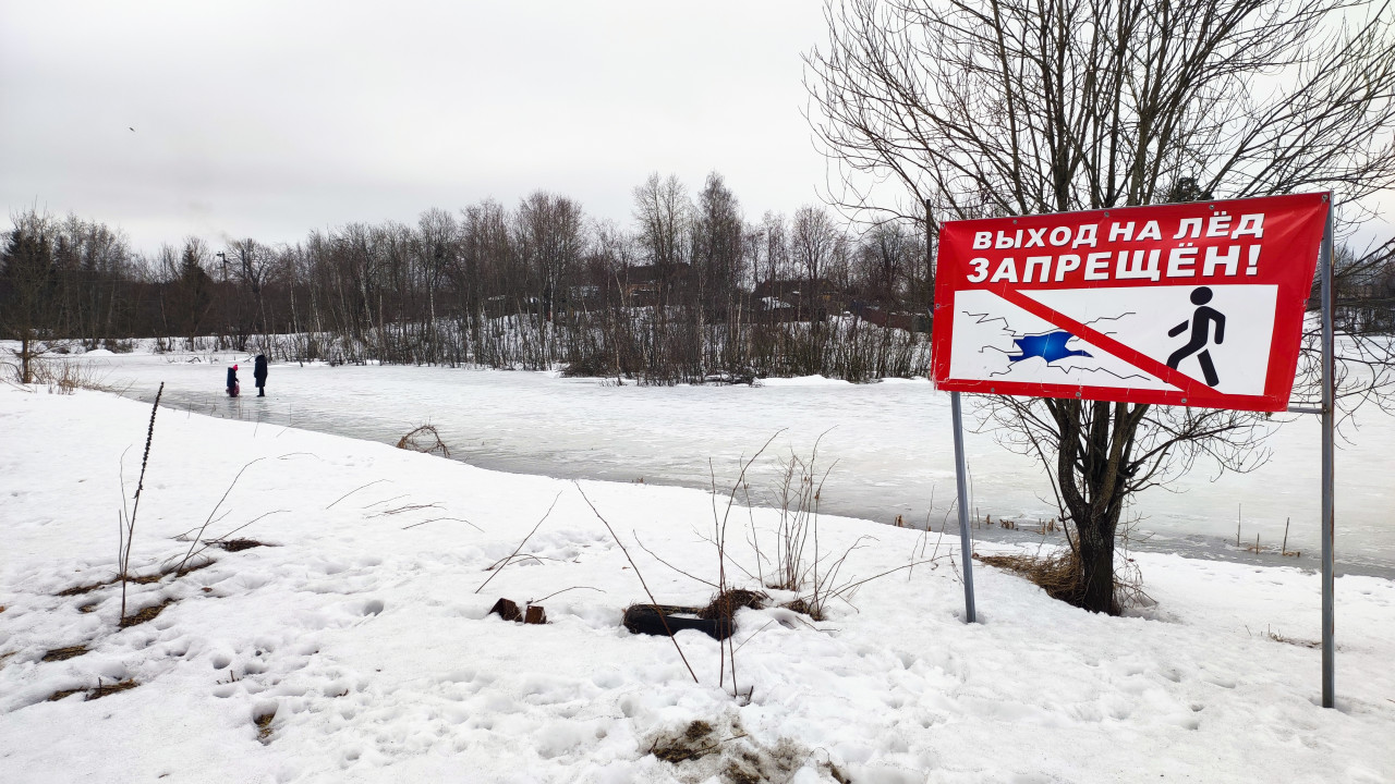 Знак «Выход на лёд запрещён» у замерзшего пруда с людьми на льду