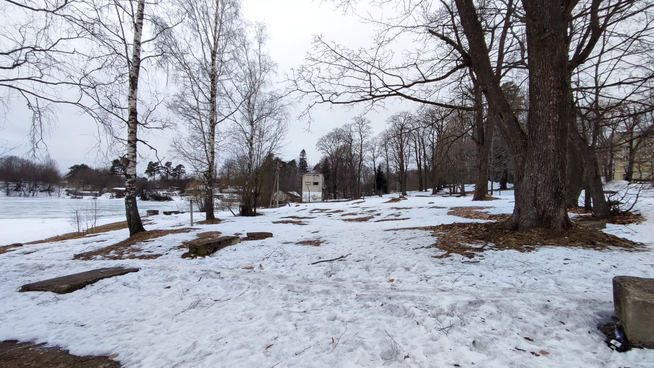 На фотографии запечатлён зимний городской парк с частично заснеженной землёй и лиственными деревьями без листвы. В центре кадра виднеется старое двухэтажное кирпичное здание с граффити на стенах, вероятно, бывший хозяйственный объект. На заднем плане виден замерзший водоём с прибрежными деревьями и частными домами. Сцена снята в пасмурную погоду, типичную для конца зимы в северных широтах. Фото подходит для иллюстрации тем зимней природы, городской среды и архитектурного наследия советского периода.