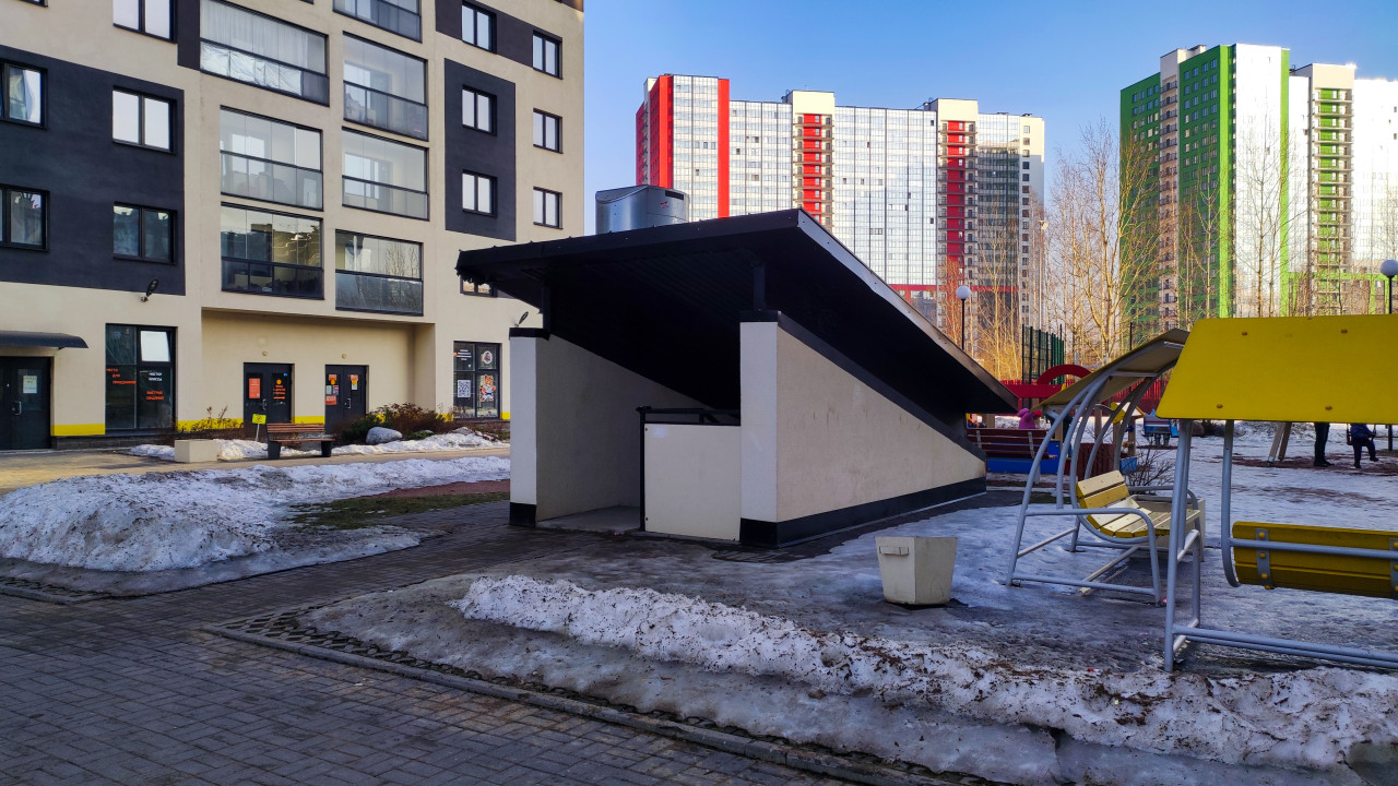 Фотография показывает конструкцию накрытого входа, ведущего к подземному уровню или вспомогательному помещению во дворе жилого комплекса. Рядом расположены детские игровые элементы и качели, а на заднем плане — фасады многоэтажных домов с контрастными вставками. На земле виден подтаявший снег, характерный для зимне-весеннего периода. Кадр демонстрирует типичную для современных кварталов комбинацию технических сооружений и рекреационной зоны.