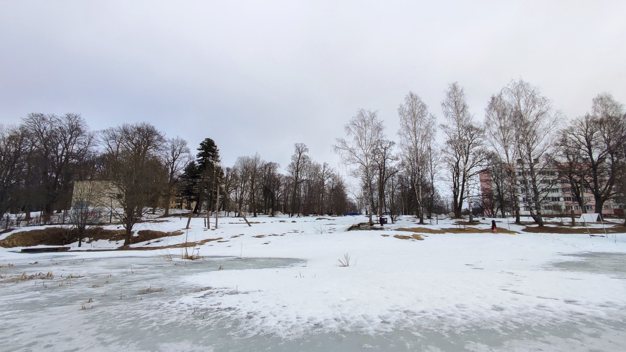 На фотографии изображён замёрзший водоём, частично покрытый снегом и льдом. На заднем плане виден городской парк с берёзами и другими лиственными деревьями без листвы. Справа находится многоэтажное здание жилого типа, типичное для российских городов. Погода пасмурная, небо серое. Снимок отражает характерный вид российской зимы в спальных районах. Фото подходит для иллюстраций о городской экологии, сезонах и климате средней полосы России.