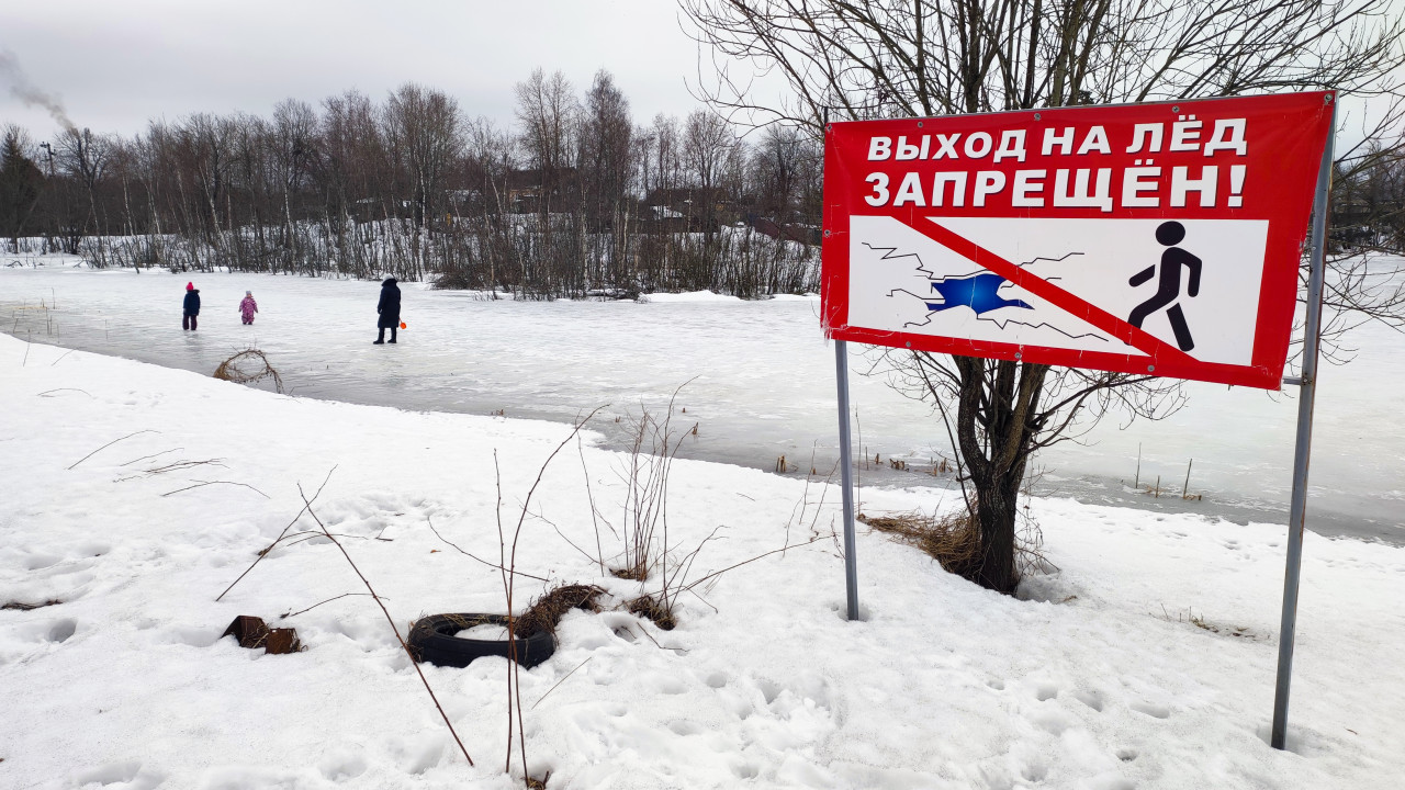 Люди на льду у запрещающего знака