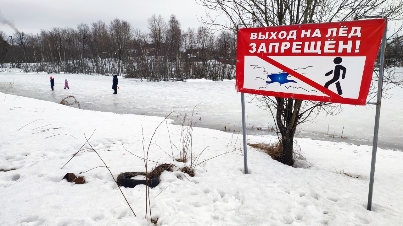 Зимний берег с предупреждением о запрете выхода на лёд