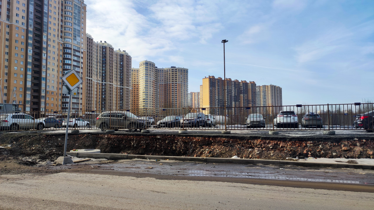 На снимке показан городской пейзаж с рядом современных многоэтажных жилых домов. На переднем плане — парковка с автомобилями и металлическое ограждение. Асфальтовое покрытие частично разрушено, виден слой грунта и кирпичного щебня. Фото сделано зимой, при рассеянном дневном свете. Кадр иллюстрирует особенности урбанистической застройки и инженерных проблем городов. Подходит для статей о строительстве и городской инфраструктуре.
