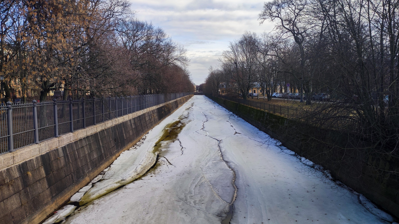 На снимке изображён канал, частично покрытый льдом, обрамлённый гранитными стенками и металлической оградой. По обеим сторонам канала тянутся ряды деревьев без листвы, что указывает на позднюю зиму или начало весны. На заднем плане видны здания с классической архитектурой, характерной для исторического Кронштадта. Фотография отражает атмосферу старого города и может использоваться для публикаций о Санкт-Петербурге, природе и инженерных сооружениях.