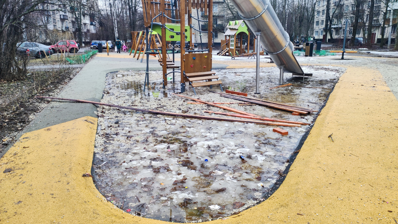 На фото изображена площадка для детей с металлической горкой и качелями, окружённая жилыми домами. На поверхности видно много талой воды и льда, местами выступают фрагменты покрытий. Деревья без листвы и пасмурное небо указывают на конец зимы. Снимок показывает типичное состояние дворов в межсезонье и может использоваться в публикациях о проблемах городской среды.