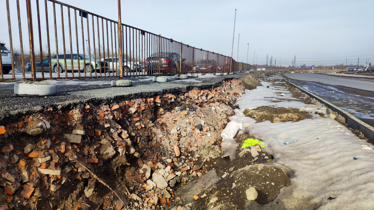 Разрушенный край парковочной площадки с металлическим забором