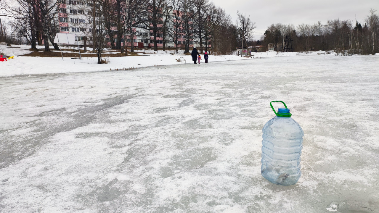 На переднем плане изображена большая пластиковая бутылка с зелёной ручкой, стоящая на поверхности замерзшего пруда. На фоне видны люди, гуляющие по льду, и многоэтажный жилой дом с розовыми фасадами. Сцена типична для северных городов зимой, когда водоёмы покрываются льдом. Снимок может быть использован для материалов о загрязнении окружающей среды, экологии, повседневной жизни и погодных условиях.