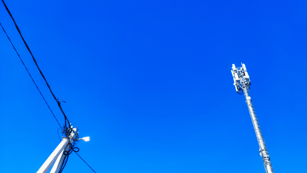 На изображении видны две конструкции — бетонный столб с уличным осветительным прибором и рядом расположенная высокая антенная мачта базовой станции связи. В верхней части кадра доминирует голубое небо без облаков, что подчёркивает вертикальные линии опор. Провода воздушных линий идут от фонарного столба к соседним опорам, указывая на инженерную связку локальной сети. Сцена передаёт особенности размещения телекоммуникационной и уличной инфраструктуры в малых населённых пунктах. Изображение может использоваться в статьях о модернизации инженерных сетей.