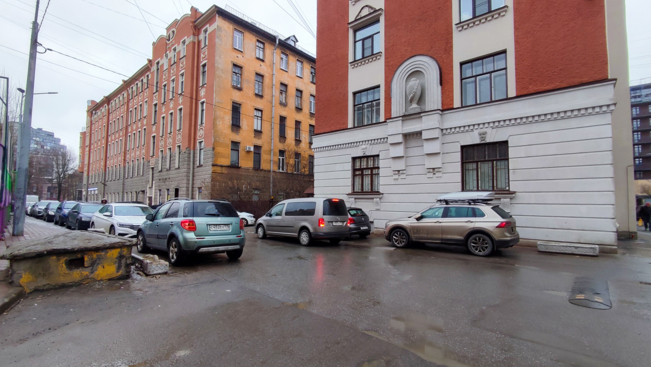 На фотографии показан городской двор Санкт-Петербурга с типичной архитектурой начала XX века. На переднем плане — припаркованные автомобили, в том числе Volkswagen и Skoda. Справа виден красно-белый фасад здания с нишей и барельефом, характерным для неоклассического стиля. На заднем плане — кирпичные и штукатурные дома с декоративными элементами. Атмосфера пасмурного дня подчёркивает характерный облик петербургских дворов. Снимок можно использовать в темах урбанистики, архитектуры и городской среды.