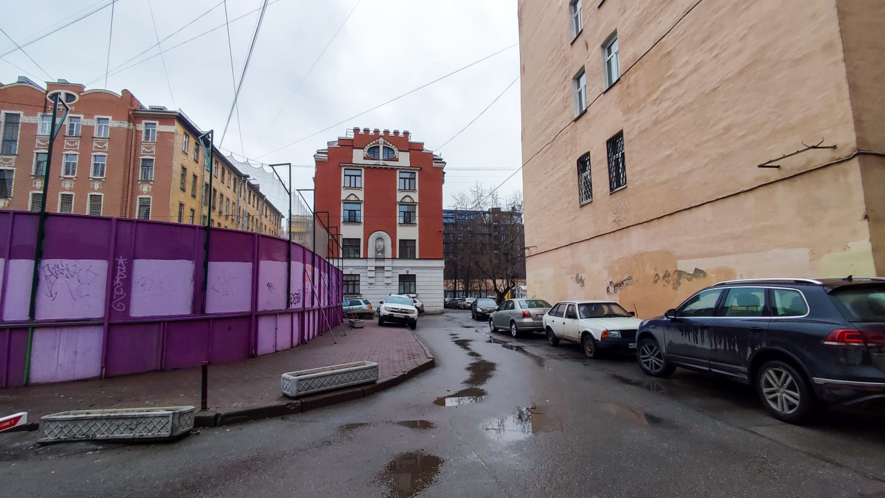 На снимке изображён узкий внутридворовый проезд между жилыми домами в Санкт-Петербурге. Справа — фасад старого дома с потертой штукатуркой, слева — фиолетовое ограждение спортивной площадки и краснокирпичное здание с декоративными элементами начала XX века. Асфальт влажный после осадков, вдоль улицы припаркованы автомобили. Атмосфера пасмурного дня создаёт характерный городской пейзаж Петербурга. Фото подходит для тем о городской архитектуре и урбанистике.