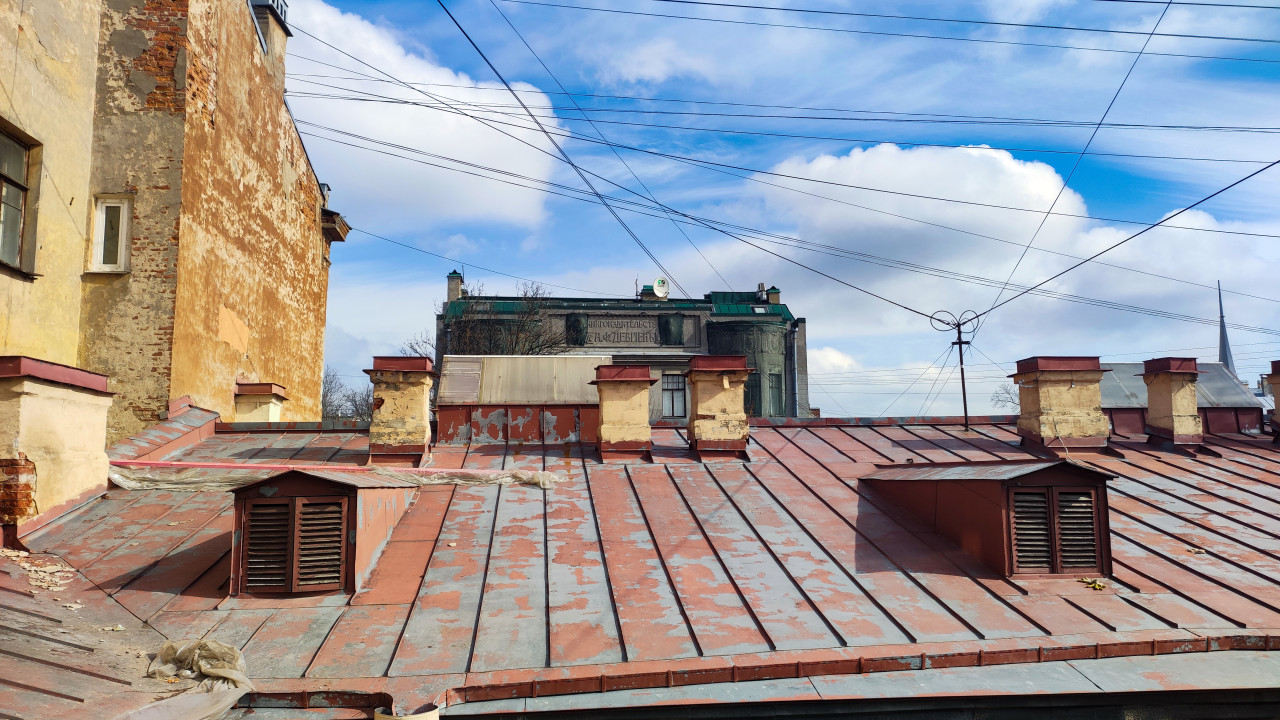 На фотографии изображена металлическая кровля старого жилого дома с несколькими кирпичными дымоходами и вентиляционными шахтами, типичными для архитектуры конца XIX – начала XX века. В кадре виден фасад соседнего здания с сохранившейся надписью советского периода и характерной лепниной. Металлическое покрытие крыши имеет следы коррозии и старения, что свидетельствует о длительном сроке эксплуатации. Изображение может использоваться для публикаций о городской архитектуре, реставрации и инженерных системах старых построек.