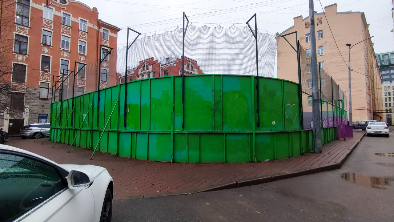 На фотографии изображена спортивная площадка с высоким зелёным металлическим ограждением и натянутой сеткой сверху. Она расположена между жилыми домами начала XX века в Санкт-Петербурге, фасады которых выполнены в характерном стиле с лепными элементами и кирпичной отделкой. По периметру стоят фонарные столбы и припаркованные автомобили. Асфальт мокрый, небо затянуто облаками, что указывает на осенне-зимний сезон. Снимок подходит для использования в материалах о городской инфраструктуре и благоустройстве дворов.
