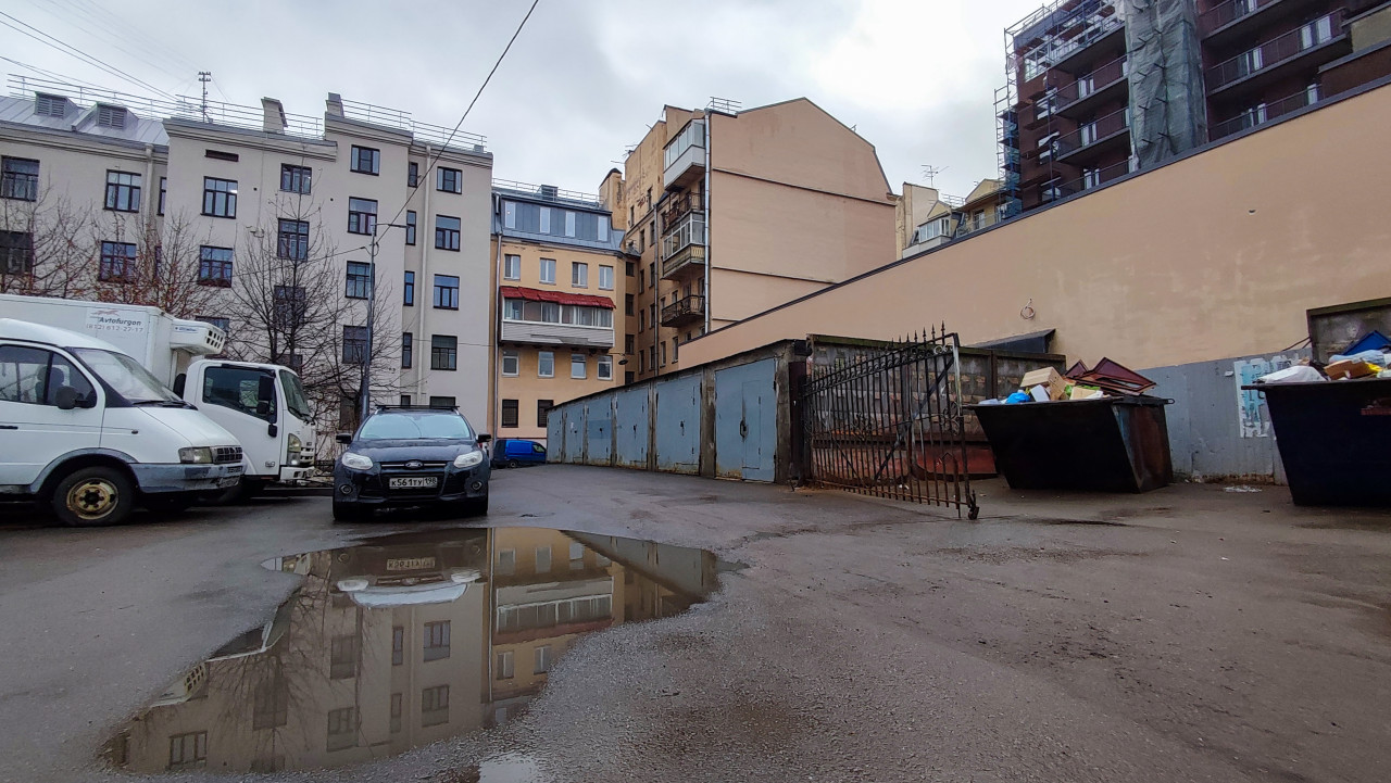 Фотография фиксирует часть внутреннего двора с металлическими гаражами, воротами и мусорными контейнерами. На переднем плане заметна большая лужа, отражающая дома. На заднем плане — многоквартирные здания с балконами и следами реконструкции. Слева припаркованы грузовые машины и легковой автомобиль. Атмосфера кадра типична для дворов Петербурга в межсезонье. Сцена может использоваться в материалах о городской экологии, благоустройстве и коммунальной инфраструктуре.