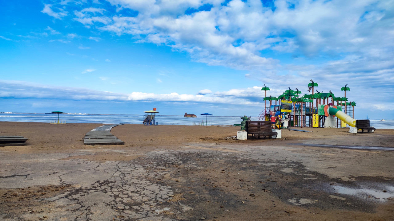 На фотографии изображён городской пляж Кронштадта в Санкт-Петербурге в межсезонье. На переднем плане видно потрескавшееся покрытие и деревянный настил, ведущий к песчаному берегу Финского залива. Слева установлены пляжные зонты и спасательная вышка, справа — красочная детская площадка в виде тропического острова с горками и пальмами. Море спокойное, небо покрыто облаками. Снимок можно использовать для публикаций о городской инфраструктуре, туризме и прибрежных зонах.