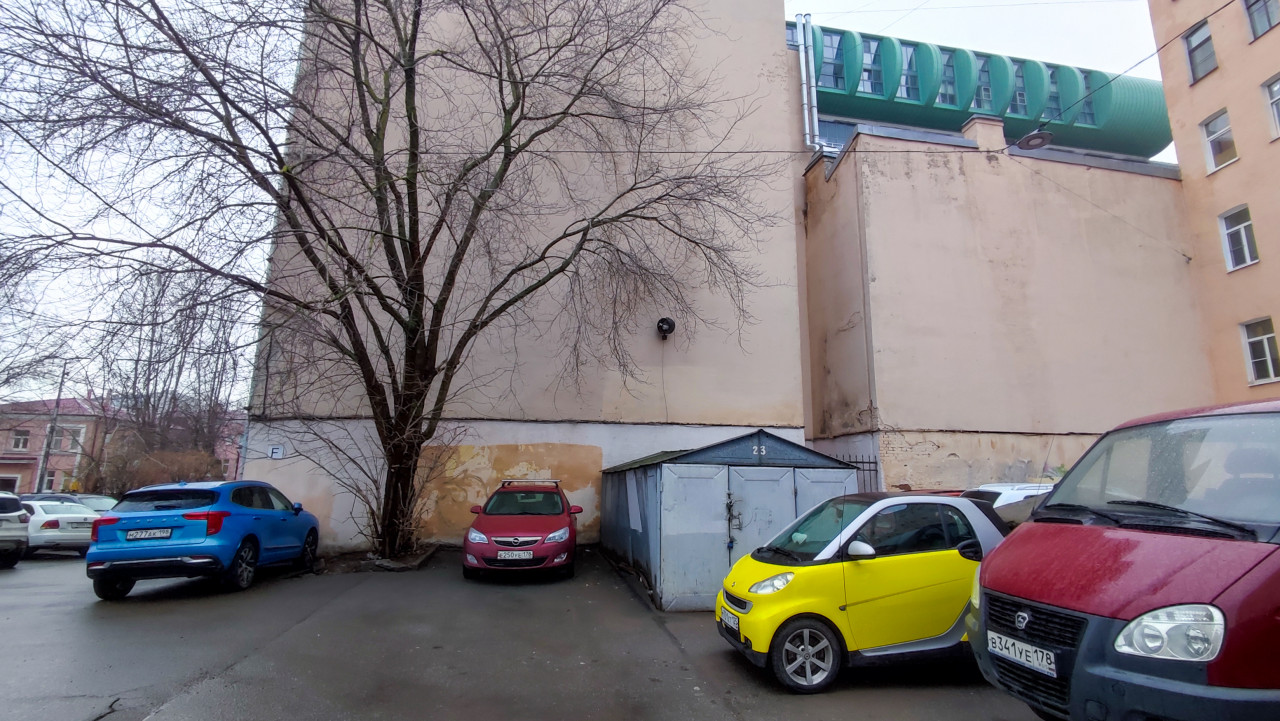 На снимке изображен двор с припаркованными машинами — синим, красным и желтым автомобилями — возле стены многоквартирного дома. На фасаде видны следы старой штукатурки и коммуникационные трубы. Слева стоит дерево без листвы, у стены расположен металлический гараж. Сцена типична для дворов жилых кварталов России. Фото можно использовать для тем урбанистики, благоустройства и городской повседневной жизни.