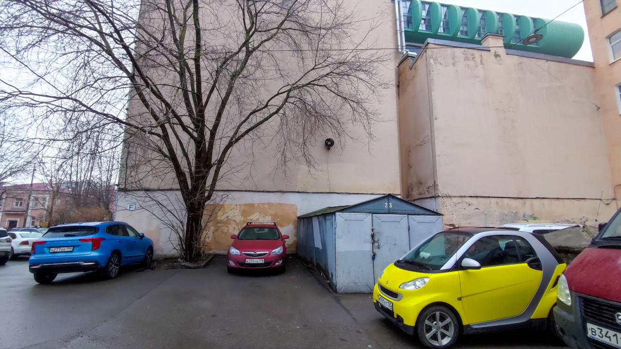 На фотографии показан городской двор с припаркованными автомобилями разных марок у стены многоэтажного дома. В центре виден металлический гараж с номером 23, рядом растет большое дерево без листвы. На заднем плане различим фрагмент современного здания с зелеными элементами фасада. Съемка выполнена в пасмурный день поздней осенью. Фото можно использовать в материалах о городской застройке, дворовой инфраструктуре и парковочных пространствах.