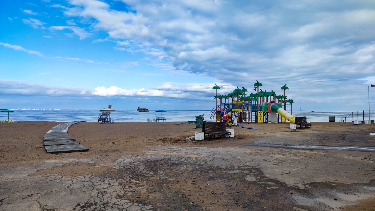 Фотография запечатлела городской пляж Кронштадта, расположенный на побережье Финского залива. На переднем плане — асфальтовое покрытие с трещинами и настил, ведущий к морю. Справа — большая детская площадка в виде тропического острова. На горизонте видна водная поверхность залива. Снимок выполнен в межсезонье и подходит для использования в материалах о городской инфраструктуре, урбанистике и прибрежных ландшафтах.