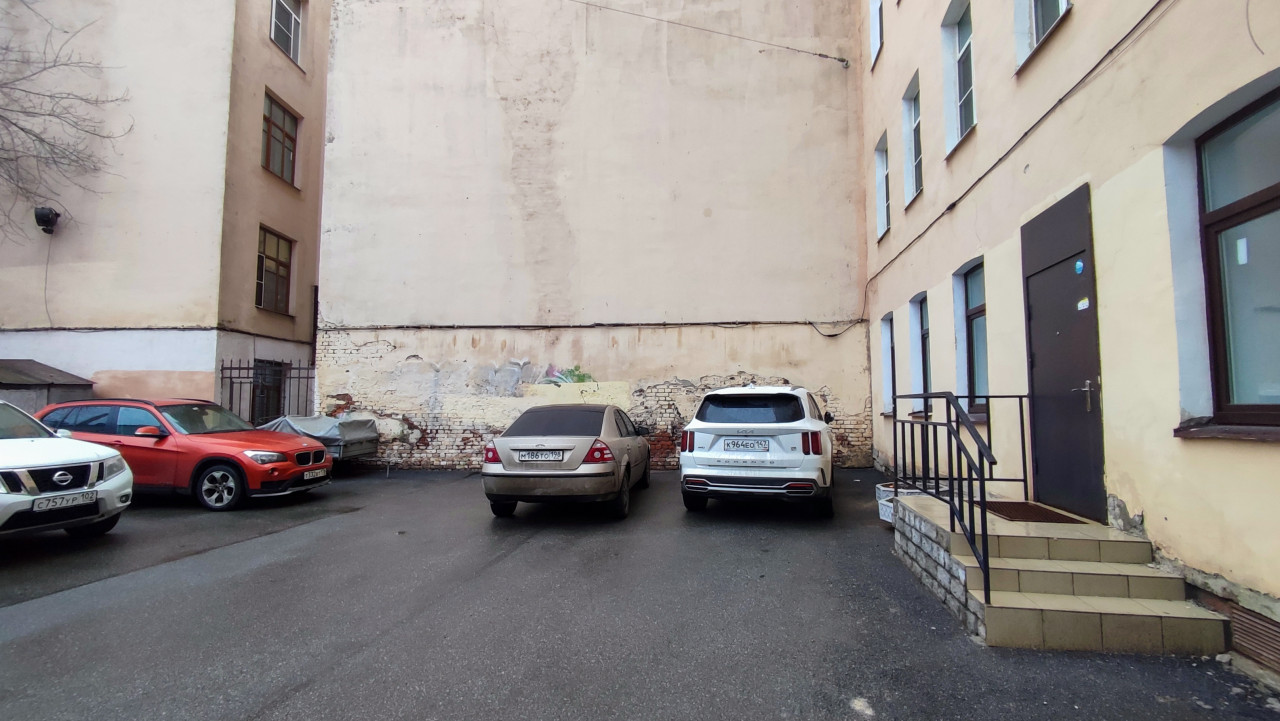 На фотографии изображена парковочная зона во дворе между домами. Слева виден фасад светло-персикового здания, справа — белое кирпичное строение. На заднем плане — исторические жилые дома начала XX века с декоративными элементами. Атмосфера типична для старых районов Санкт-Петербурга или Москвы. Фото может использоваться в материалах о городской архитектуре и жизни в исторических кварталах.