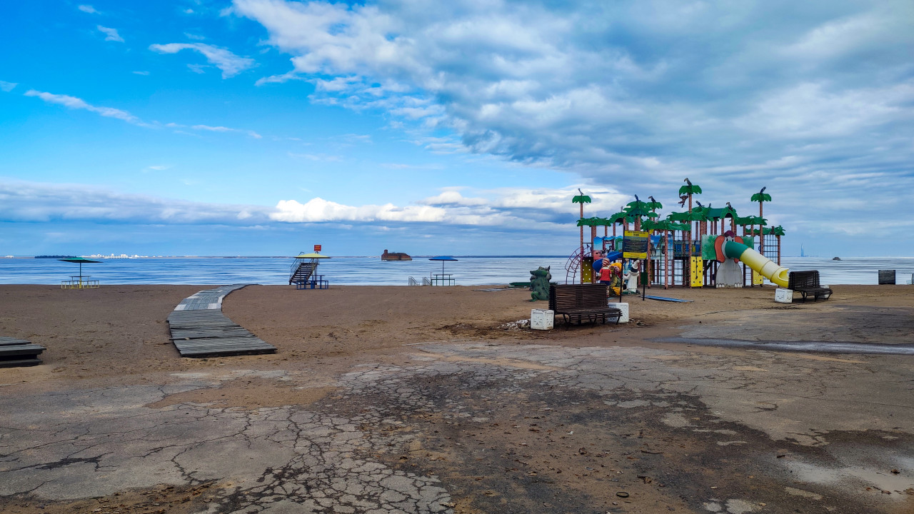 На снимке запечатлён городской пляж Кронштадта весной. На переднем плане — треснувший асфальт и деревянный настил, ведущий к песчаному берегу. Справа расположена площадка для детей с пальмами и горкой. На заднем плане видна спокойная водная гладь Финского залива и лёгкая облачность. Фото передаёт атмосферу приморского города в межсезонье и используется для публикаций о благоустройстве и городской среде Санкт-Петербурга.