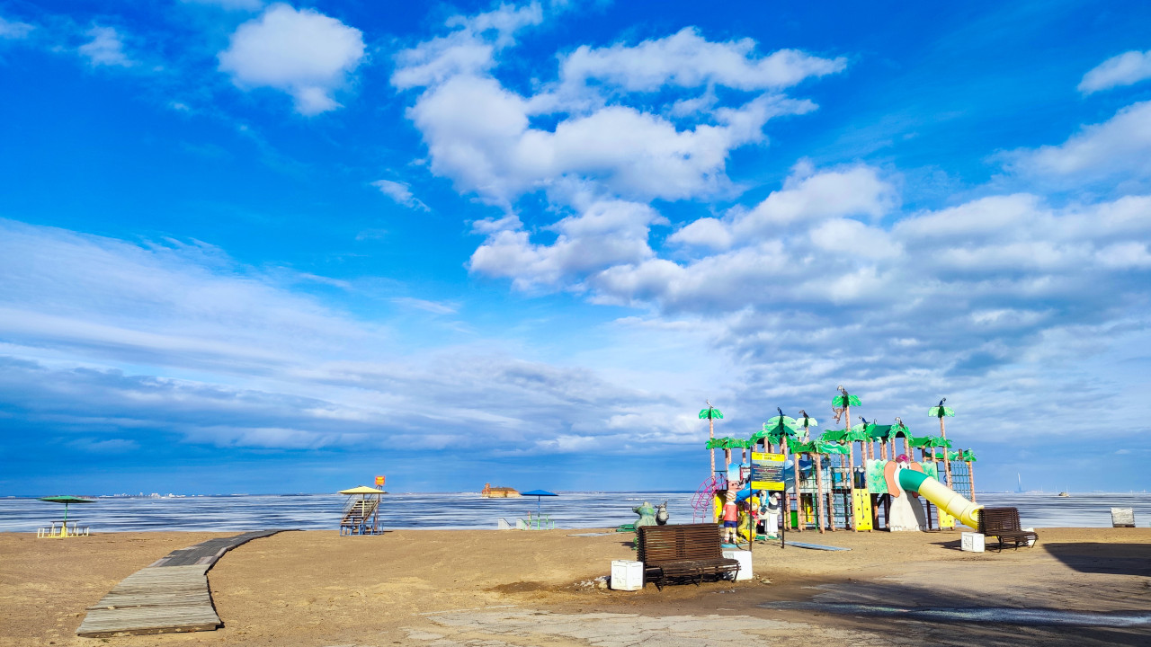 На фотографии изображён песчаный пляж в Кронштадте, где установлены скамейки, детская площадка и деревянный настил, ведущий к воде. На горизонте — замёрзший Финский залив, над ним рассеянные облака. Снимок сделан днём при солнечном свете. Фото передаёт атмосферу спокойствия северного побережья и может использоваться для туристических и информационных публикаций.