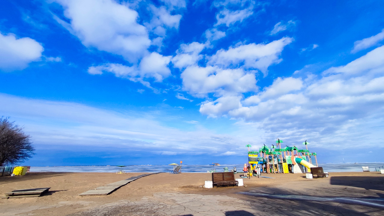 Весенний пляж Кронштадта с видом на Финский залив и детскую площадку