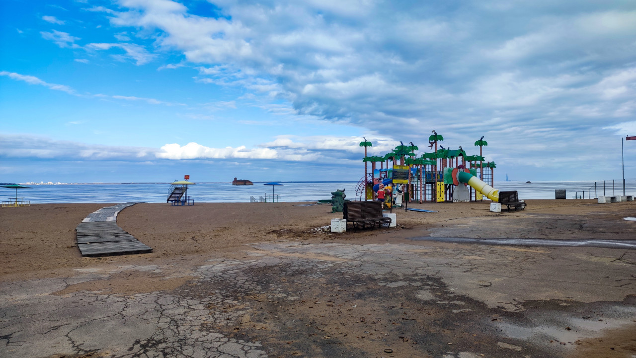На фото изображён городской пляж Кронштадта в Санкт-Петербурге с настилом и песчаной зоной. На переднем плане — лавочки и участок асфальта, ведущий к берегу. Справа — детская площадка с декоративными пальмами и длинной горкой. На заднем плане — Финский залив под переменной облачностью. Фото сделано весной и отражает вид прибрежной зоны в межсезонье. Подходит для публикаций о городской среде, туризме и урбанистике.