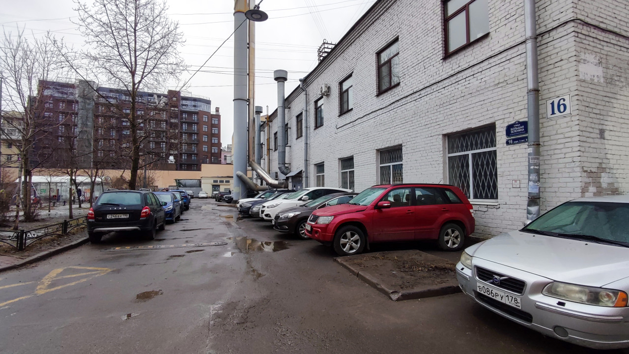 На изображении видна парковка у белого кирпичного здания с номером 16, вероятно административного назначения. Рядом стоят автомобили, деревья без листвы и уличные светильники. В глубине видны жилые и современные здания из красного кирпича. Снимок сделан зимой в Санкт-Петербурге. Может использоваться для тем о городской инфраструктуре, парковках и уличной застройке.