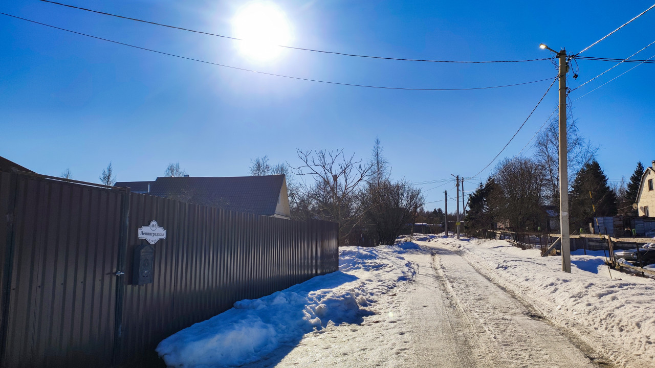 На изображении зафиксирована загородная улица в зимний период, с заснеженной обочиной и металлическим забором вдоль правой стороны. Над дорогой проходят воздушные линии электропередачи, установленные на бетонных опорах. На заднем плане видны частные жилые дома. Отмечается солнечное освещение и низкое зимнее солнце, создающее яркие блики. Фото можно использовать в иллюстрациях о частной застройке, сезонной среде обитания и инженерной инфраструктуре.