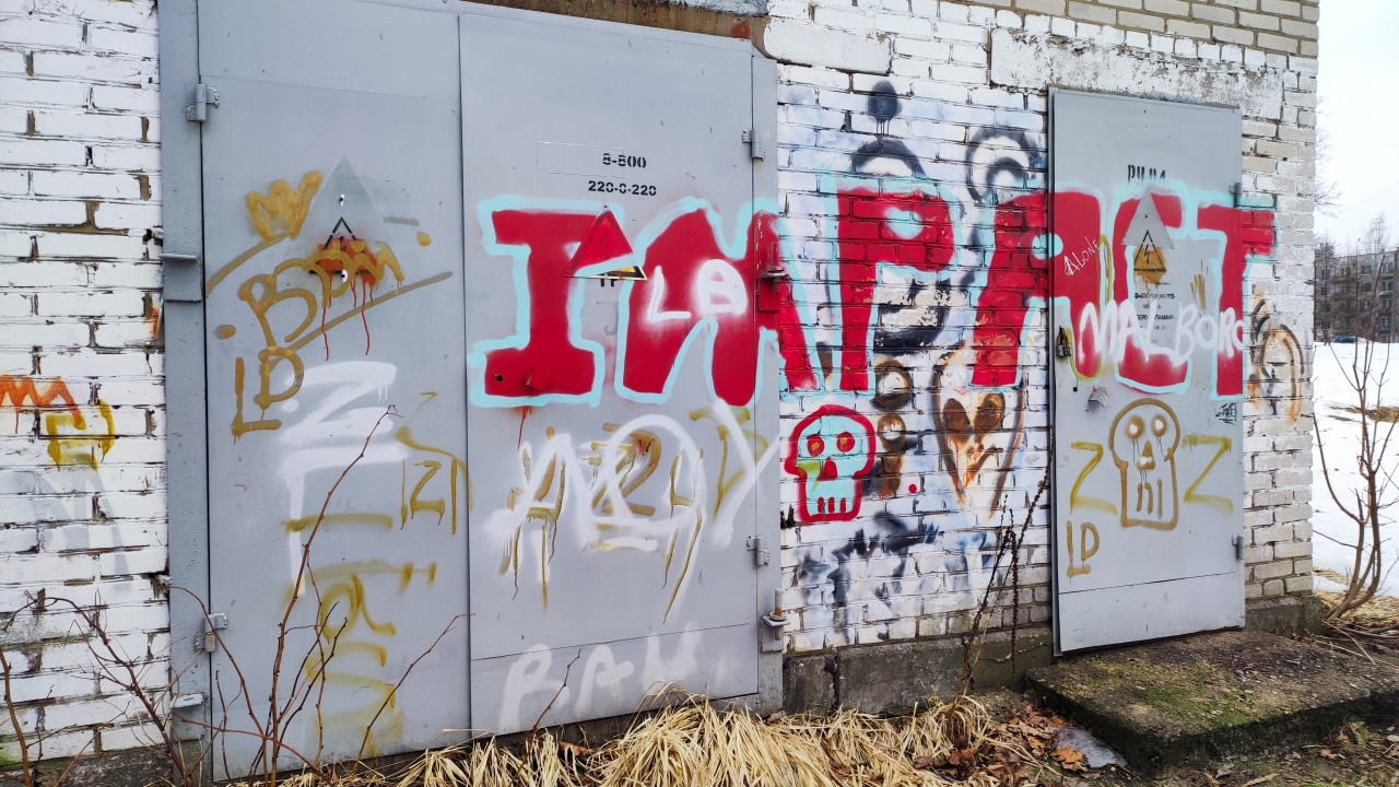 Фотография крупным планом показывает стену кирпичного строения, разрисованную множеством граффити. На металлических дверях и стене нанесены надписи, рисунки черепов и сердца. Снизу видна сухая трава и следы талого снега. Объект представляет собой техническое здание, типичное для советских жилых районов. Снимок можно использовать в публикациях об уличной культуре, визуальном искусстве и городской эстетике.