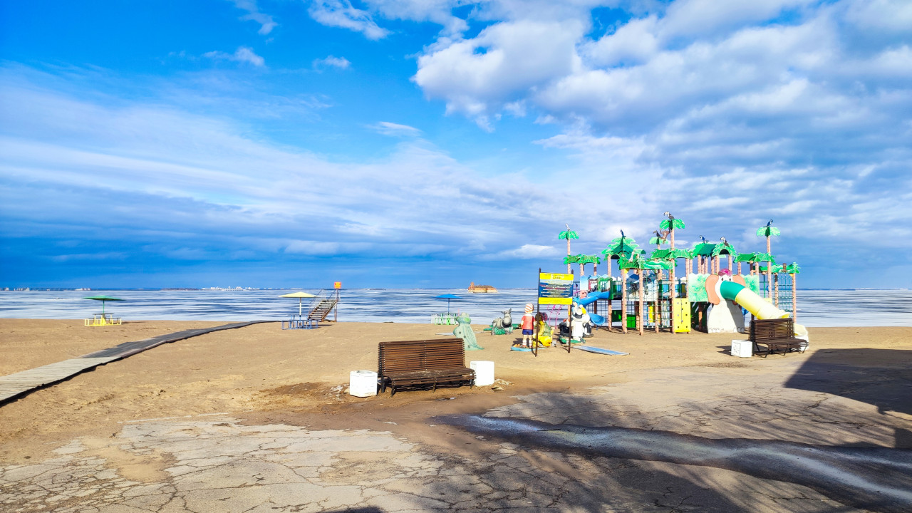 Фотография демонстрирует песчаный пляж в Кронштадте с яркой детской игровой зоной, деревянным настилом и несколькими скамейками. На горизонте видна акватория Финского залива, частично покрытая льдом. Сцена снята при переменной облачности. Пейзаж подчёркивает особенности северного климата и инфраструктуры прибрежных зон Санкт-Петербурга. Фото можно использовать в тематических публикациях о благоустройстве и туризме.