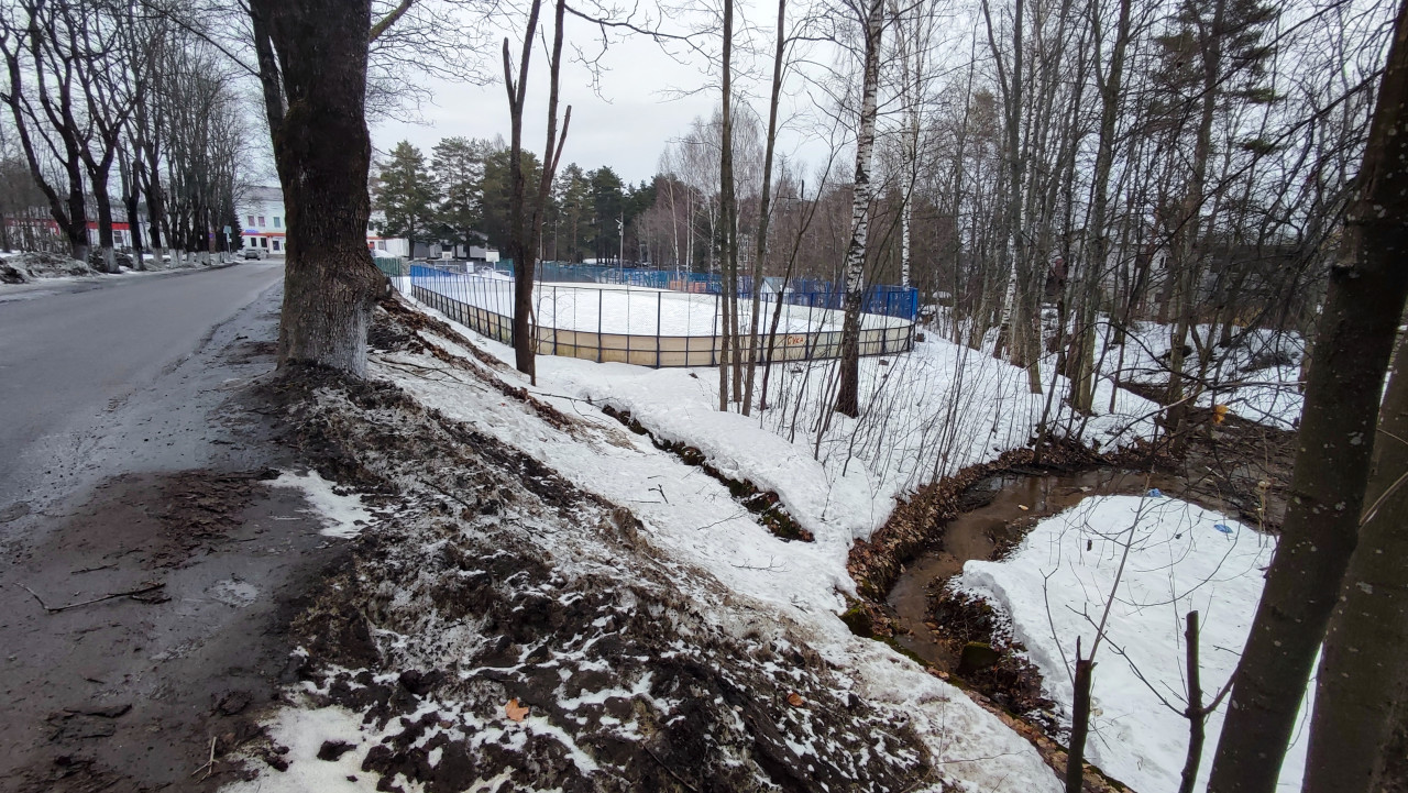 На фото изображен заснеженный участок загородной дороги, проходящей рядом с ограждённой ледовой площадкой. Вдоль дороги растут деревья, виден небольшой ручей, частично покрытый льдом. Вдали видны здания спортивного комплекса. Снимок подходит для тем зимней инфраструктуры, загородных территорий и общественных спортивных зон.