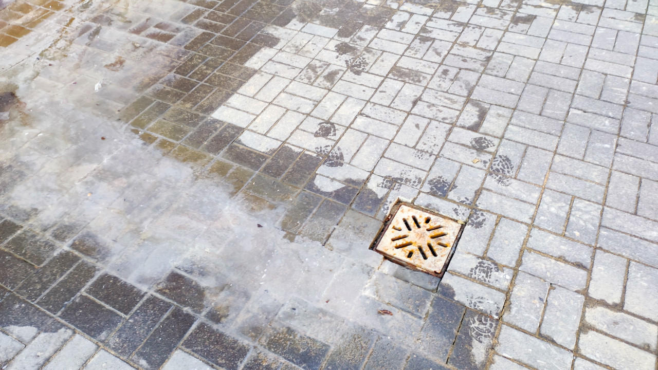 Ливнеприёмник в плиточном покрытии после таяния снега