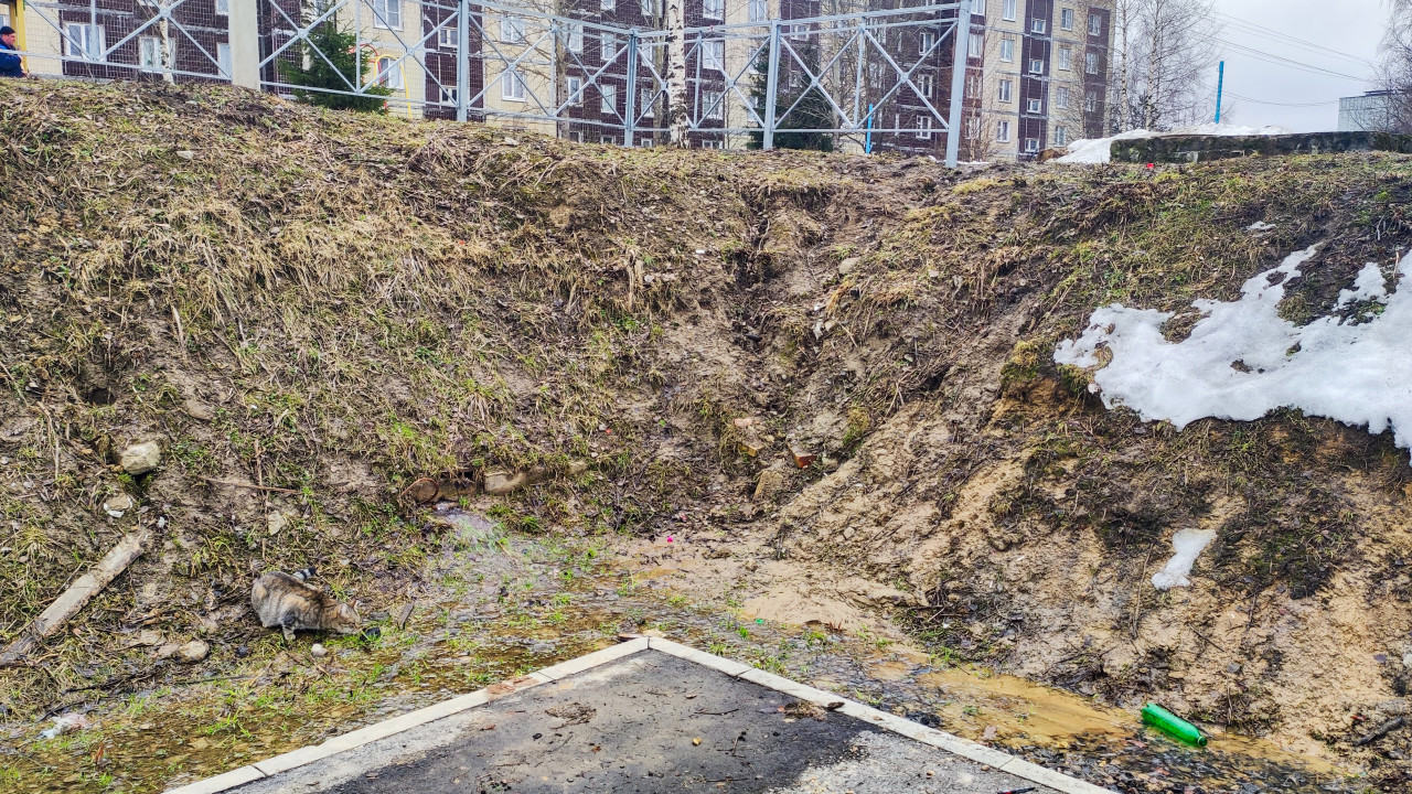 На фотографии изображён откос с остатками снега и грязью, у подножия которого сидит кошка. На заднем плане виден металлический забор и часть жилых зданий. Сцена снята весной, в условиях таяния снега и влажной почвы. Фото можно использовать в иллюстрациях о городской экологии, бездомных животных и дворовой среде.