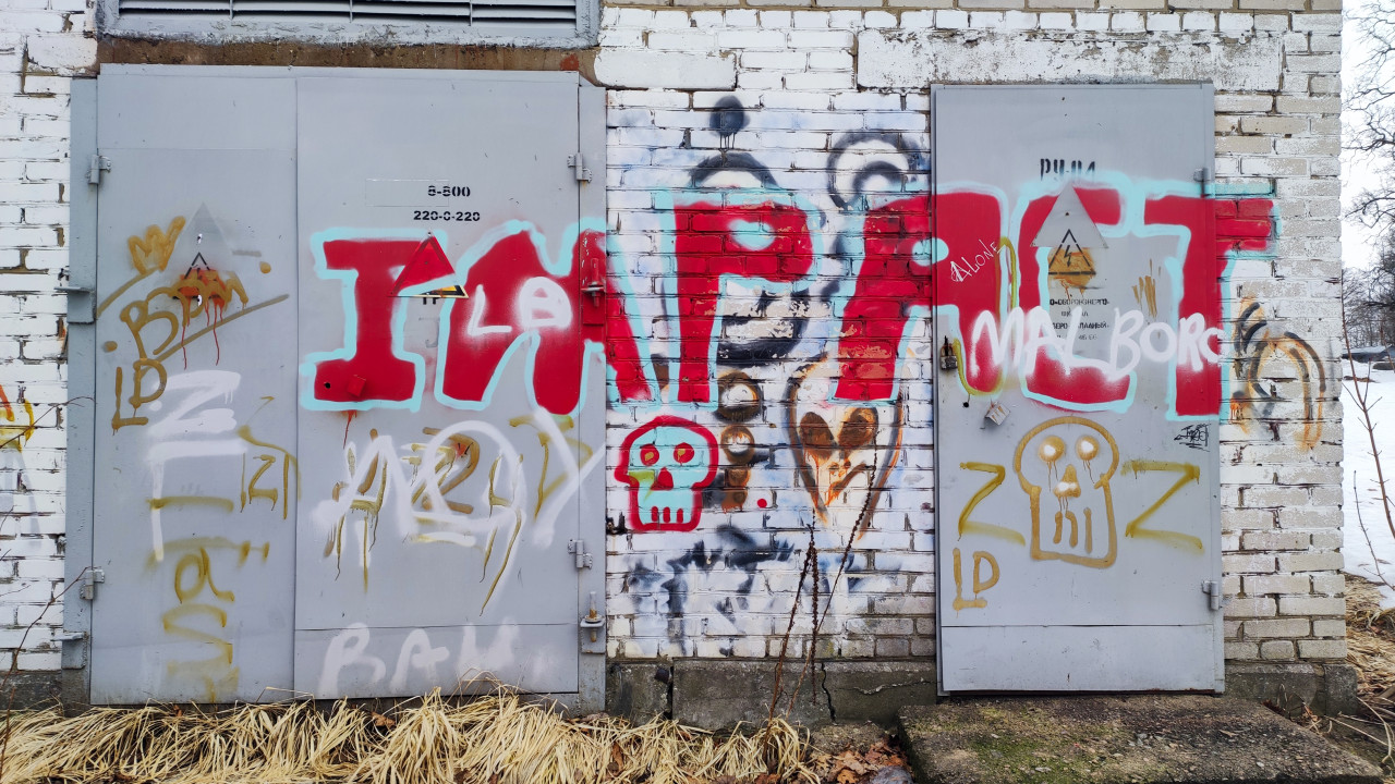 На изображении показана часть кирпичной стены и металлических дверей с множественными граффити, выполненными аэрозольной краской. Среди рисунков видны череп, слово «IMPACT» и другие символы. На переднем плане — сухая трава, а на заднем угадывается снежное покрытие. Фото передаёт атмосферу постсоветской городской среды и отражает тему уличного самовыражения. Подходит для публикаций о граффити-культуре и урбанистике.