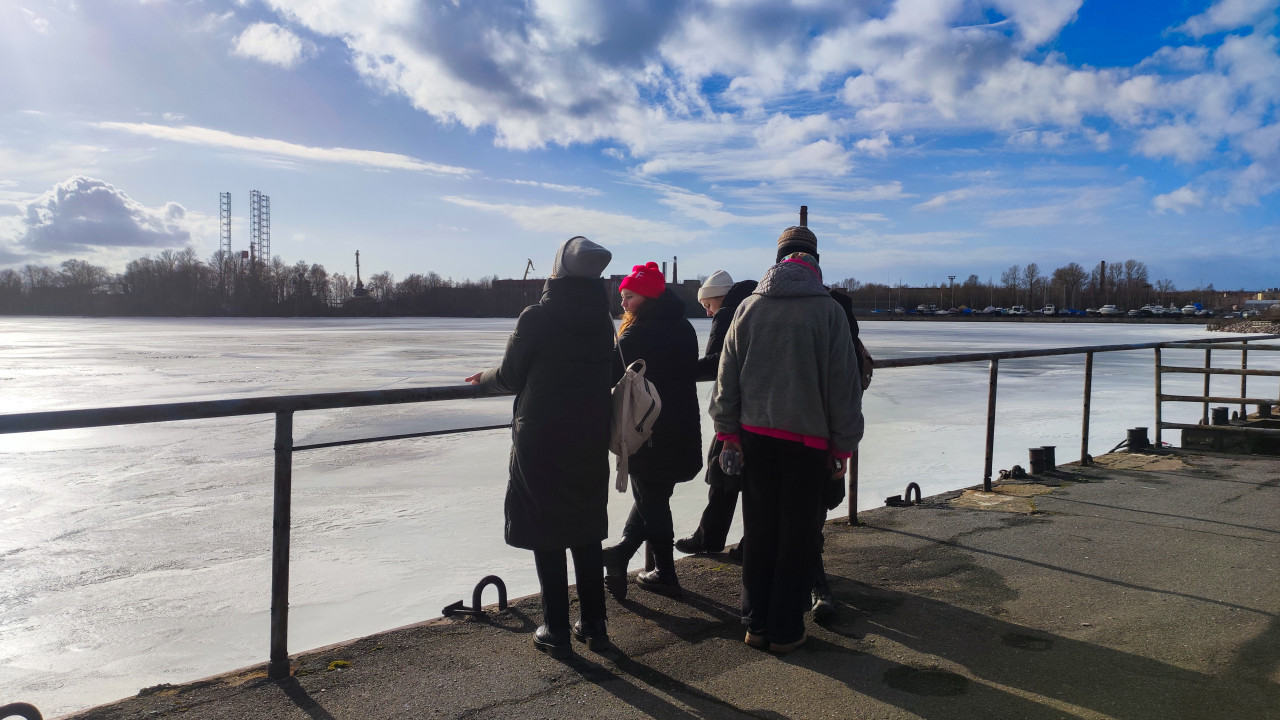 На снимке группа людей стоит у перил набережной, наблюдая за покрытой льдом акваторией. На горизонте виднеются промышленные трубы и краны, указывающие на портовую зону. Люди одеты в теплую зимнюю одежду, что подчеркивает холодное время года. Светлое небо с облаками отражается на льду. Фотография передает атмосферу прогулки у воды в конце зимы и может использоваться в публикациях о досуге, урбанистике, погоде северных городов.