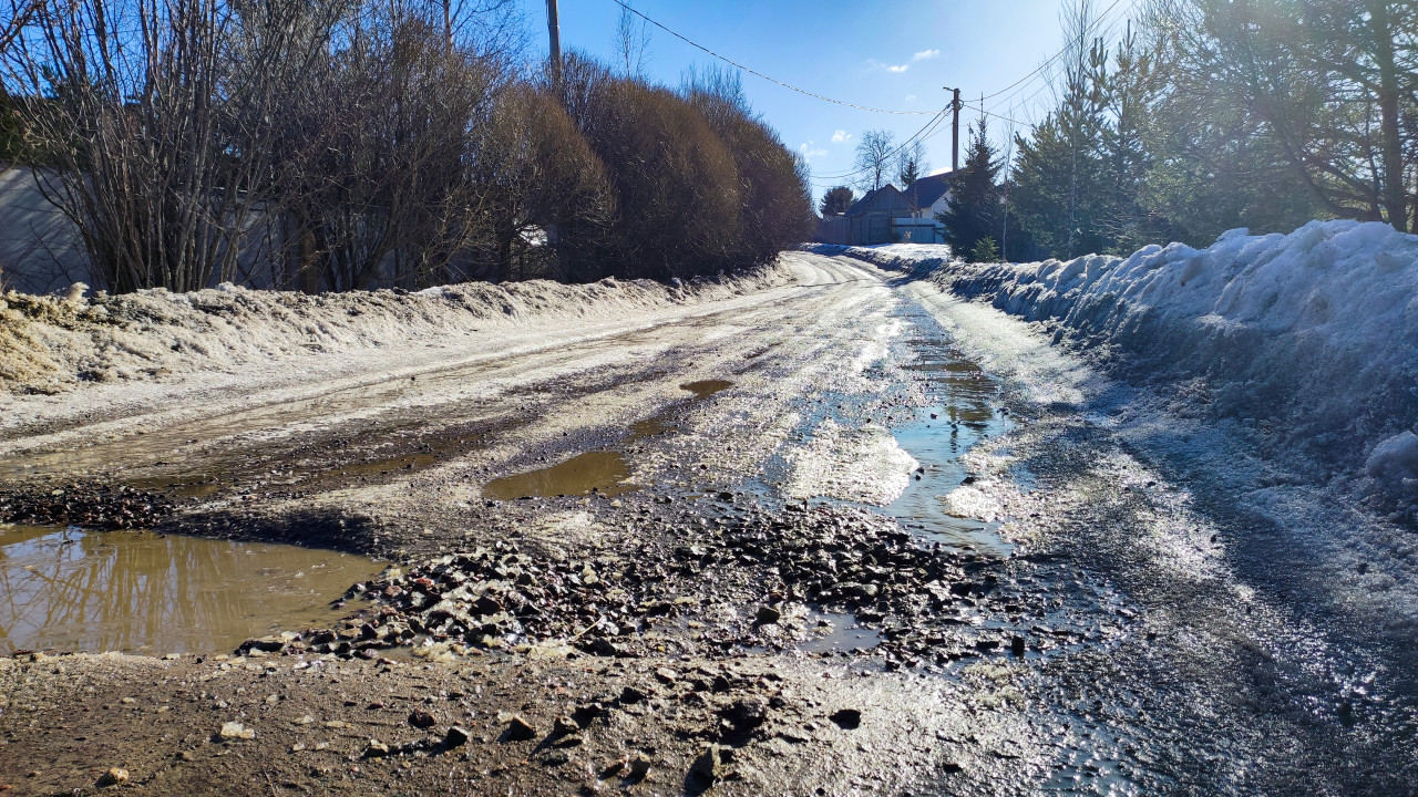 На изображении показан участок неасфальтированной дороги в частном секторе, где после оттепели образовались лужи и размытые участки грунта. По обе стороны дороги заметны сугробы, сформированные уборкой снега. На фоне видны деревья без листвы и электрические опоры, указывающие на наличие инженерных коммуникаций. Съёмка произведена в светлое время суток при низком зимнем солнце, создающем удлиненные тени. Фотография может использоваться в публикациях о дорожном содержании и сезонных изменениях в малых населенных пунктах.