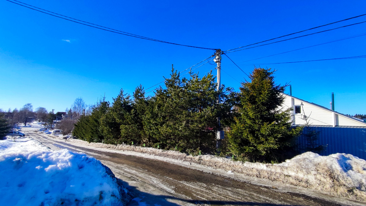 На фото видна узкая дорога с плотными сугробами и рядом хвойных деревьев, высаженных вдоль забора. Бетонная опора несёт провода, которые ведут к жилым строениям. Слева угадывается перекрёсток или поворот улицы, что указывает на развитие частной застройки. Небо чистое, зимняя дорога частично покрыта льдом и укатанным снегом. Снимок можно применять в статьях о дачных поселениях, зимнем содержании дорог и инфраструктуре частного сектора.