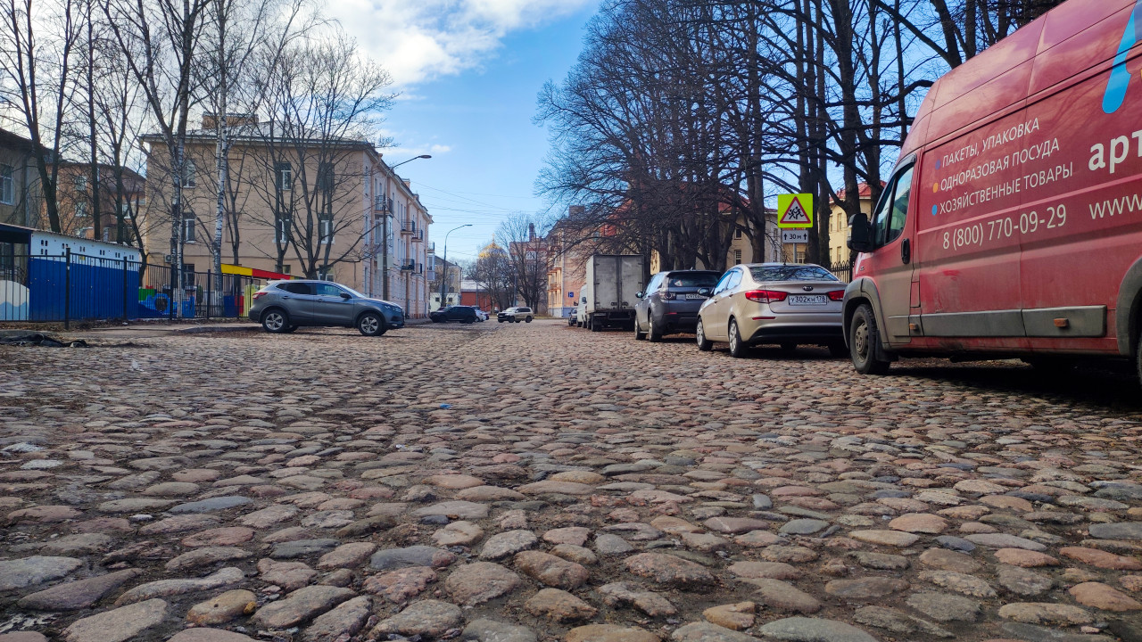 Фотография показывает городскую улицу, вымощенную крупной брусчаткой, с припаркованными автомобилями по обе стороны. По краям дороги видны здания жилого типа и деревья без листвы, что указывает на зимне-весенний сезон. На правом краю стоит фургон с рекламой хозяйственных товаров. Снимок сделан в одном из исторических районов Кронштадта. Изображение подходит для публикаций о городской среде, старинных улицах и транспортной инфраструктуре.