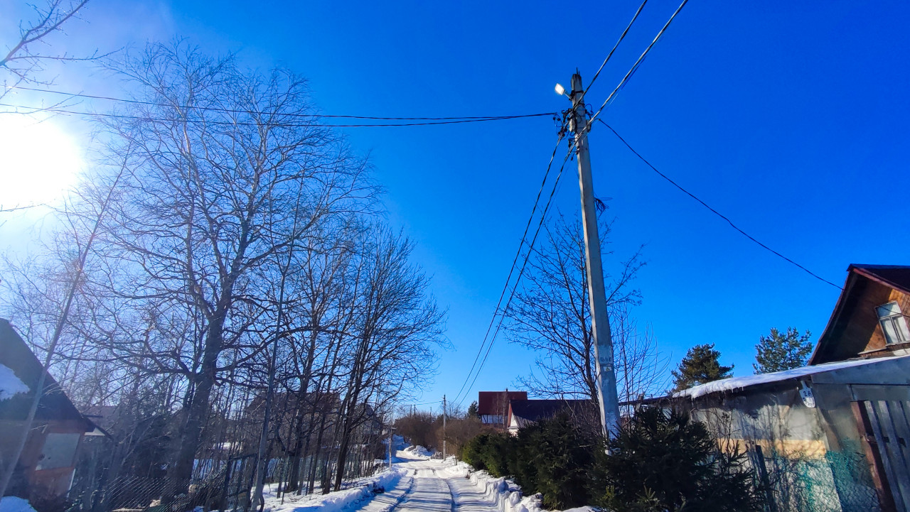 На изображении показана узкая улица в загородной застройке, вдоль которой проходят воздушные линии электропередачи, закреплённые на бетонной опоре. Справа расположены хвойные насаждения и ограждение частного участка, слева видны деревья без листвы. Присутствие снега и низкое солнце указывают на зимний сезон. Кадр фиксирует повседневный вид локальной инфраструктуры и может быть использован в материалах о сельской местности, инженерных сетях и планировке частных кварталов.