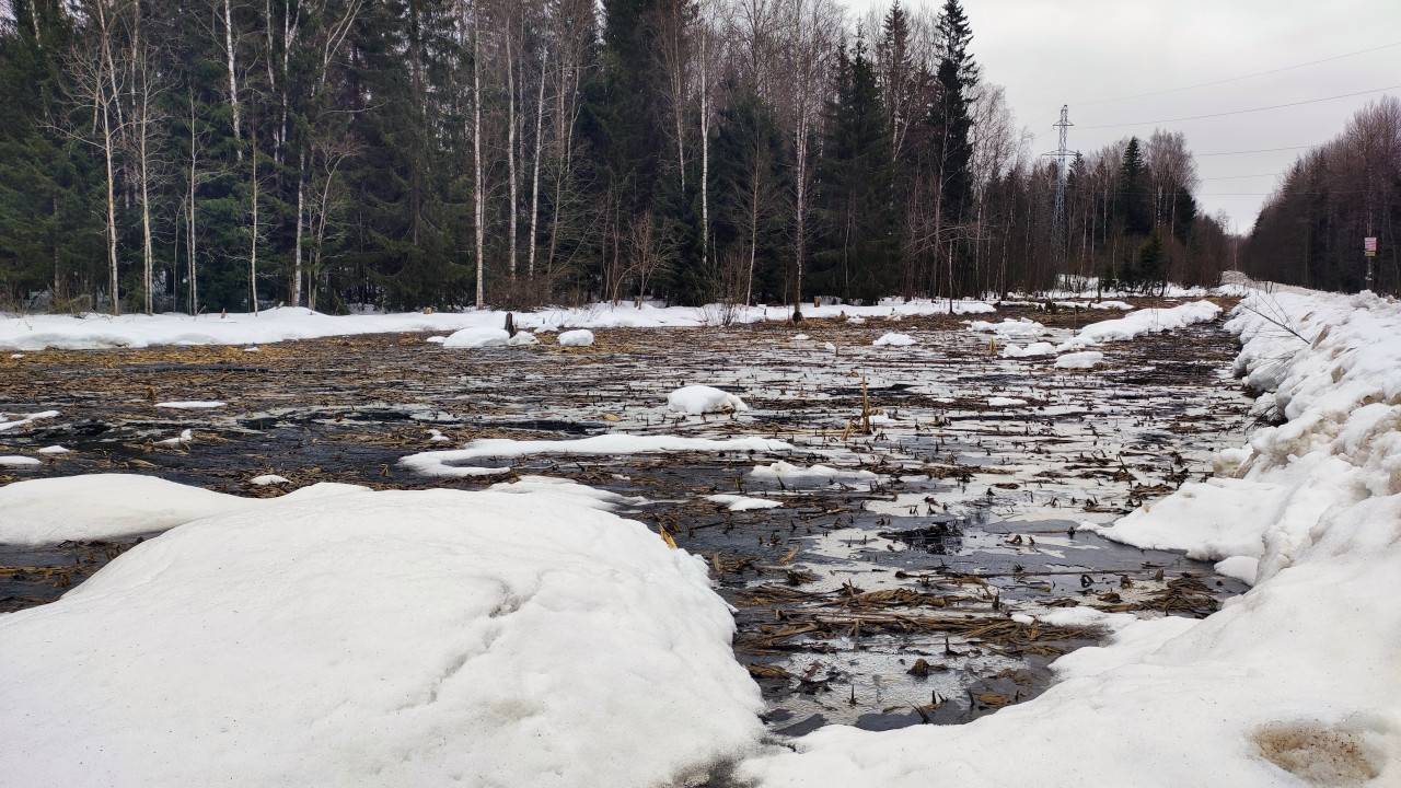 На снимке показан период весеннего снеготаяния в хвойно-берёзовом лесу. В центре кадра виден поток талой воды, стекающий по просеке, частично покрытой остатками снега и растительных остатков. По краям тянутся снежные валы, образовавшиеся от расчистки. На горизонте — линия электропередачи и смешанный лес. Сцена типична для конца марта — начала апреля в северных регионах России. Изображение можно использовать в материалах об экосистемах, климатических изменениях, сезонных явлениях и природных процессах.
