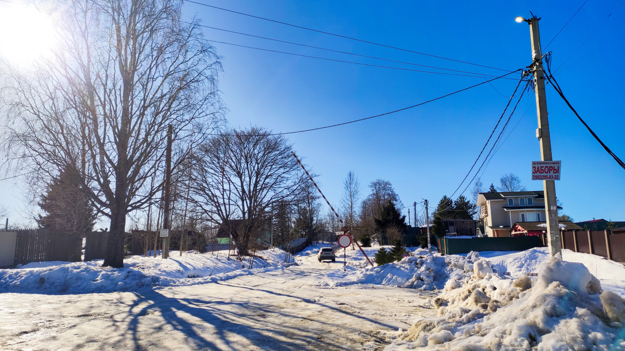 На фото изображён въезд на внутреннюю улицу частного сектора через шлагбаум, рядом расположена бетонная опора воздушной линии электропередачи с осветительным прибором. На заднем плане видны жилые дома и деревья, а на земле лежит снег, что указывает на поздне-зимний период. Комбинация инженерной инфраструктуры и контролируемого въезда отражает особенности организации доступа на частные территории. Снимок можно использовать в материалах о коттеджной застройке, управлении территорией и работе внутрипоселковых сетей.