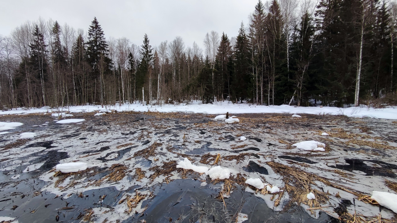 На фотографии показано подтаявшее болото в окружении хвойно-берёзового леса. Поверхность покрыта талыми водами, тонким льдом и сухими стеблями растений. Снег тает, образуя водную пленку и ледяные разломы. Лес на заднем плане состоит из елей и берёз, типичных для северной части России. Сцена отражает естественный цикл весеннего оттаивания почвы и водных экосистем. Изображение можно использовать в образовательных, научных и экологических материалах.