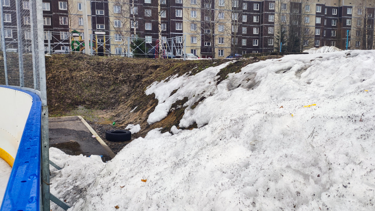 На снимке показана часть хоккейной площадки с пластиковыми бортами и металлическим ограждением. На переднем плане — снежные сугробы и мокрый асфальт. На заднем плане — жилые дома и игровая площадка. Сцена снята в пасмурную погоду ранней весной. Фото подходит для репортажей о состоянии дворовых территорий и сезонных изменениях в северных городах.
