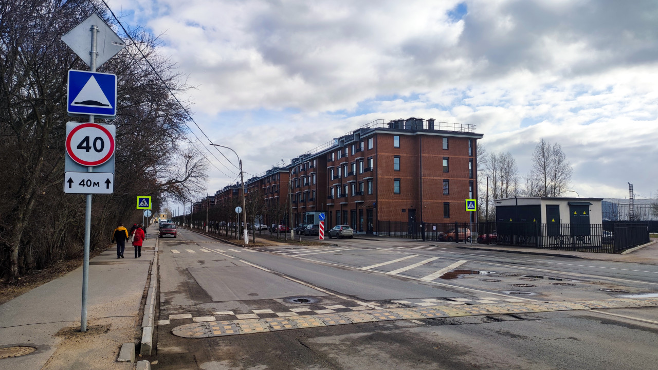 На фотографии показан участок современной улицы с новыми кирпичными жилыми домами в стиле лофт. На переднем плане — дорожные знаки, включая ограничение скорости 40 км/ч и предупреждение о неровности дороги. По тротуару идут пешеходы, вдоль улицы припаркованы автомобили. Объекты на заднем плане и планировка указывают на новую застройку промышленных территорий, характерную для Санкт-Петербурга последних лет. Кадр может использоваться для тем о городской реконструкции и благоустройстве.