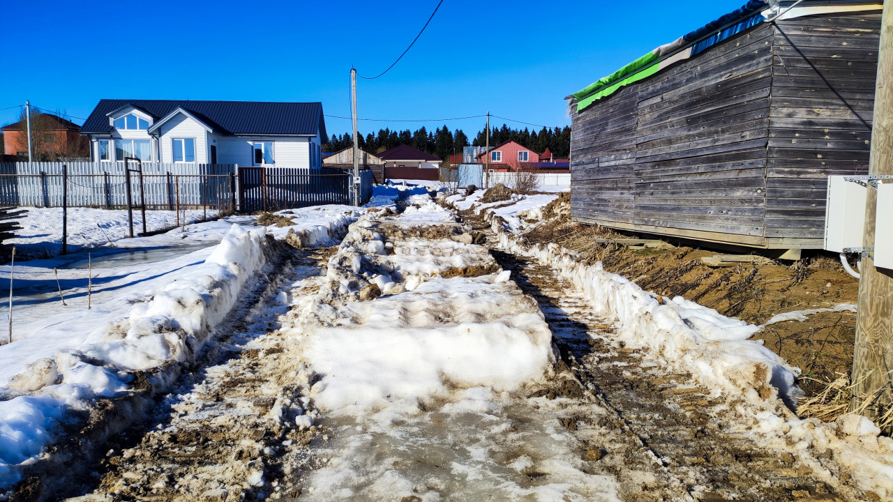 На изображении показана узкая дорога в частном секторе, покрытая снегом и протаявшими колеями, с высокими насыпями вдоль краев. Слева расположен забор и участок с домом, справа — вытянутое деревянное строение, устанавливаемое на временных опорах. Видна опора электролинии с проводами, что указывает на жилую инфраструктуру. Фото сделано в переходный сезон, когда снежный покров активно тает. Кадр может использоваться для публикаций о загородных улицах, сезонных сложностях передвижения и условиях проживания в малоэтажной застройке.