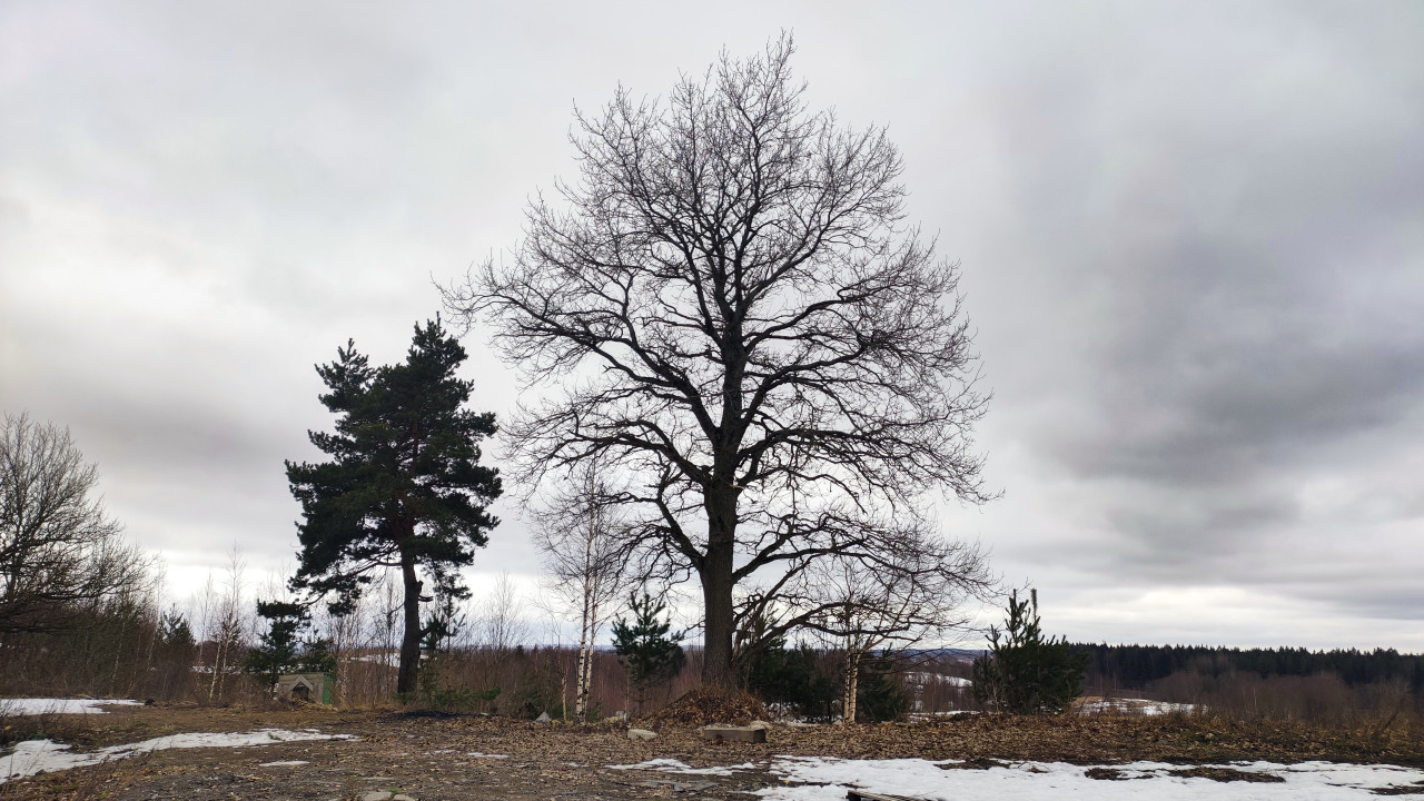 Снимок показывает крупное дерево без листвы, стоящее среди других деревьев в начале весны. На заднем плане виднеются хвойные деревья и поле с остатками снега. Облака плотные, серые, создающие ощущение прохладной погоды. Композиция подчёркивает структуру ветвей и сезонный контраст между замиранием природы и ожиданием пробуждения. Фотография подходит для использования в проектах о смене времён года и природных ритмах умеренной зоны.