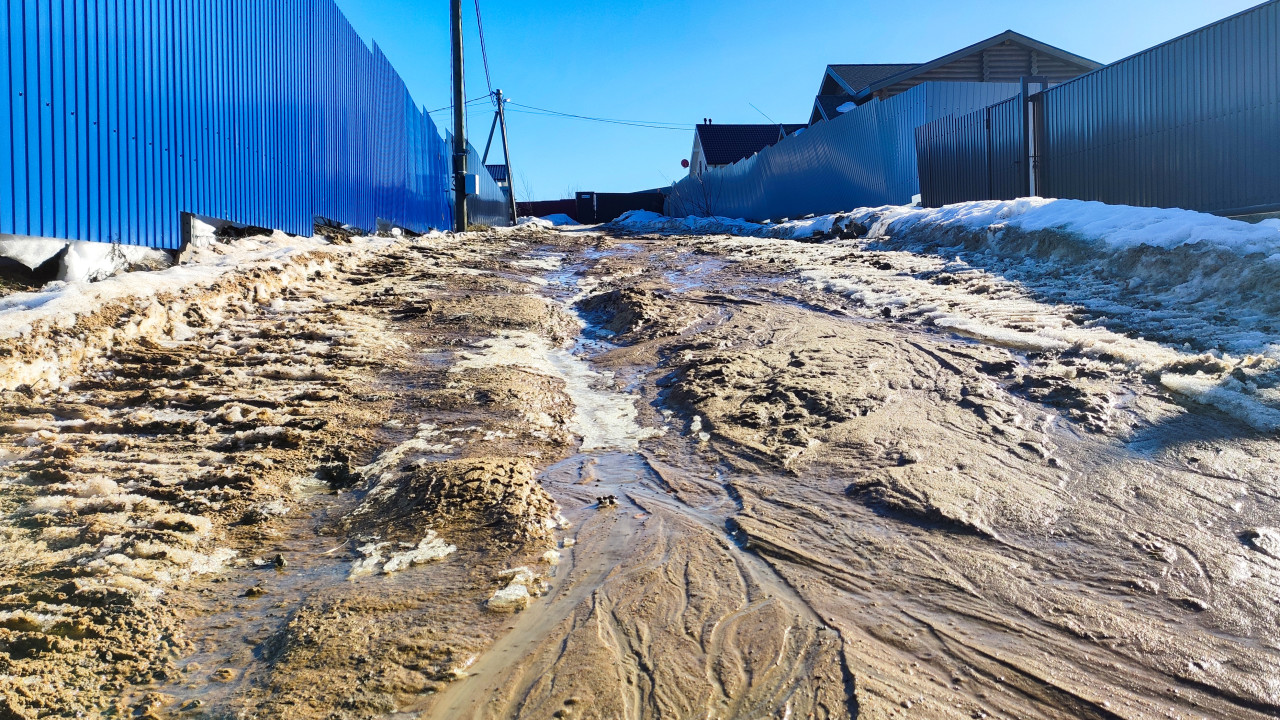 Фотография отображает грунтовую дорогу в пригородной застройке, сильно размыtую талыми потоками, с выраженными колеями и разжиженным грунтом. По обеим сторонам размещены высокие металлические ограждения, за которыми угадываются частные участки и постройки. Снег на обочинах находится на стадии активного таяния, что усиливает водонасыщение дорожного полотна. На дальнем плане заметна опора воздушных линий электроснабжения. Снимок можно использовать в контексте сезонного состояния дорожной сети, благоустройства и проживания за городом.
